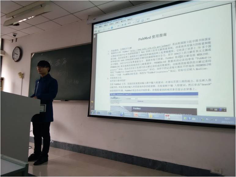 PubMed是目前医学文献利用率最高的网上免费数据库,也是项目组在准备讲稿、题库等资料时的重点内容。组员就其检索方式如主题词检索MeSH、运算符号如截词符*、检索字段标识符如[TI]、布尔逻辑运算符如AND及高级检索进行了介绍和演示;Wed of science是ISI三大引文数据库的Web版,专为化学及药物研究人员需求设计,并且可以查看收录杂志期刊的影响因子,这也是它与其他很多数据库最大不同之一,接着组员就影响因子、查全率及具体使用方法做了简单介绍;Medline、GenBank、Dynamed、Springer Link也是主讲内容,组员分别讲解了其使用领域及方法。